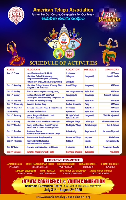 ఆటా అధ్యక్షుడు శ్రీ జయంత్ చల్ల (Jayanth Challa) గారి సహాయ సహకారాలతో, ఆటా ప్రెసిడెంట్ ఎలెక్ట్ & ఆటా వేడుకల కమిటీ చైర్ శ్రీ సతీష్ రెడ్డి (Satish Reddy) గారి ఆధ్వర్యంలో ఆటా వేడుకలు డిసెంబర్ 12 నుండి 27 వరకు జరగబోతున్నాయి.