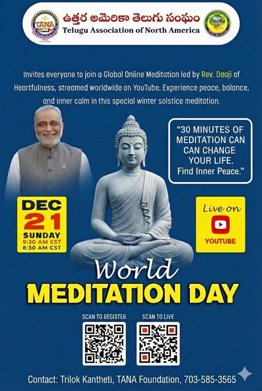 డిసెంబర్ 21న జరుపుకునే ప్రపంచ ధ్యాన దినోత్సవం (World Meditation Day) సందర్భంగా, ఉత్తర అమెరికా తెలుగు సంఘం (TANA) తెలుగు సమాజాన్ని ఒక విశిష్ట గ్లోబల్ ఆధ్యాత్మిక కార్యక్రమానికి ఆహ్వానిస్తోంది. హార్ట్ఫుల్నెస్ ఇన్స్టిట్యూట్ మరియు శ్రీ రామ్ చంద్ర మిషన్ (Shri Ram Chandra Mission) సంయుక్తంగా నిర్వహిస్తున్న గ్లోబల్ ఆన్లైన్ మెడిటేషన్ సెషన్లో పాల్గొనవలసిందిగా తానా పిలుపునిచ్చింది.