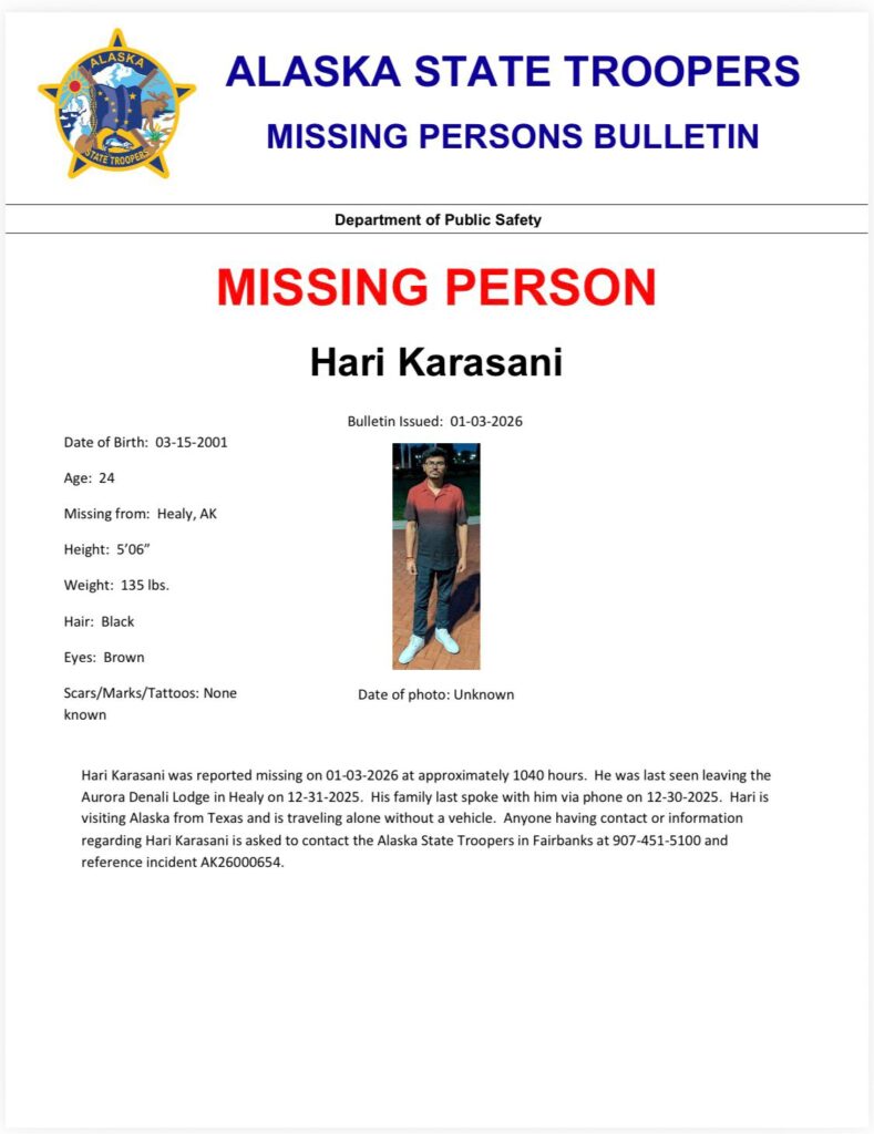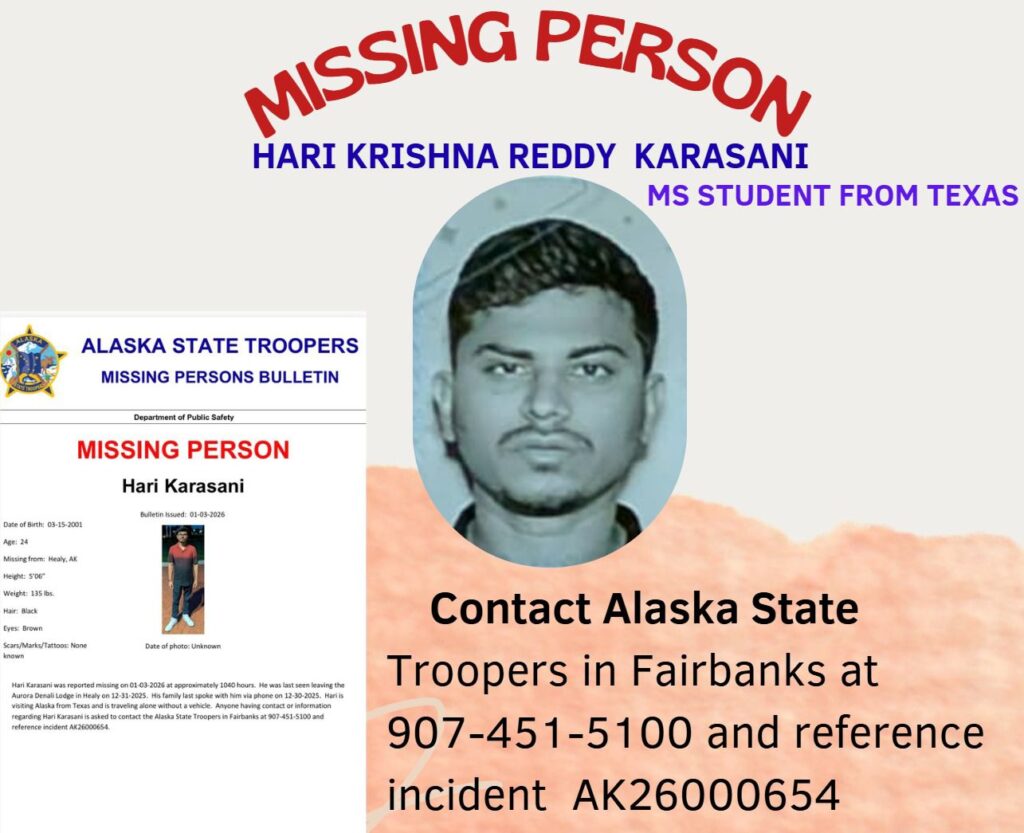 హ్యూస్టన్ (Houston, Texas) లో నివసిస్తున్న హరి కరసాని క్రిస్మస్ (Christmas) సెలవుల నేపథ్యంలో డిసెంబర్ 22, 2025న ఒంటరిగా అలాస్కా (Alaska) పర్యటనకు వెళ్లారు. అక్కడ డెనాలి సమీపంలోని ఒక హోటల్లో బస చేశారు. జనవరి 3 లేదా 4 నాటికి తిరిగి వస్తానని తన రూమ్మేట్స్కు సమాచారం ఇచ్చారు. అయితే డిసెంబర్ 30న చివరిసారిగా స్నేహితులతో మాట్లాడిన హరి (Hari Krishna Reddy Karasani) ఆ మరుసటి రోజు డిసెంబర్ 31 హోటల్ నుంచి చెక్-అవుట్ అయ్యారు. అప్పటి నుండి ఆయన ఫోన్ స్విచ్ ఆఫ్ అయింది.