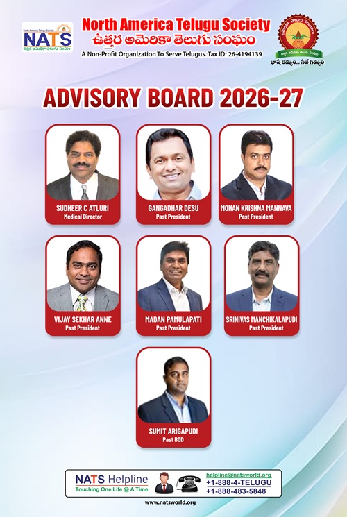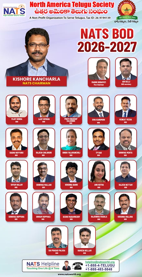 వచ్చే రెండు సంవత్సరాలకు బోర్డ్ డైరెక్టర్లను నాట్స్ (North America Telugu Society – NATS) ప్రకటించింది. 2026-27 సంవత్సరాలకు ఇప్పటికే నాట్స్ బోర్డ్ చైర్మన్గా కిషోర్ కంచర్ల (Kishore Kancharla) ను నియమించిన నాట్స్.. తాజాగా నాట్స్ బోర్డులో మిగిలిన డైరెక్టర్ల అందరి పేర్లను ప్రకటించింది. నాట్స్ బోర్డ్ వైస్ ఛైర్మన్గా మధు బోడపాటి (Madhu Bodapati), నాట్స్ బోర్డ్ కార్యదర్శిగా ఆది గెల్లి (Adi Gelli) లకు బాధ్యతలు అప్పగించింది. నాట్స్ ప్రకటించిన బోర్డ్ ఆఫ్ డైరక్టర్ల జాబితా ఇదే.
