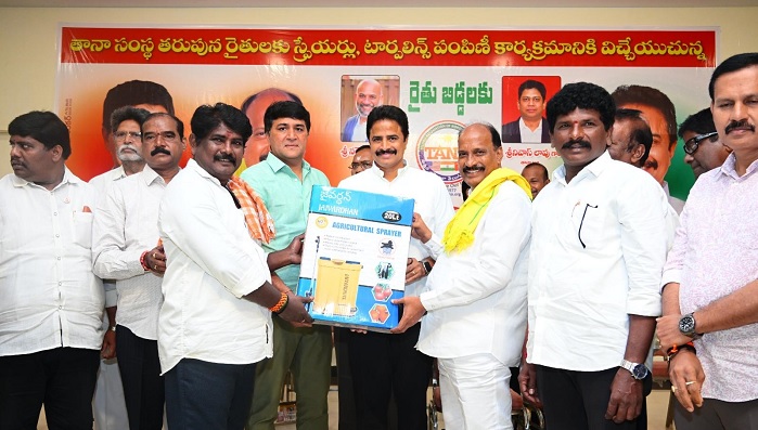 Tanuku, Andhra Pradesh: పశ్చిమ గోదావరి జిల్లా తణుకు పట్టణంలోని వీ.కే. ఫంక్షన్ హాల్లో తానా (TANA) ఆధ్వర్యంలో “రైతు కోసం” కార్యక్రమం ఘనంగా నిర్వహించారు. ఈ కార్యక్రమంలో భాగంగా సుమారు 1000 మంది రైతులకు 25 లక్షల విలువ గల పవర్ స్ప్రేయర్లు మరియు టార్పాలిన్లు పంపిణీ చేశారు.