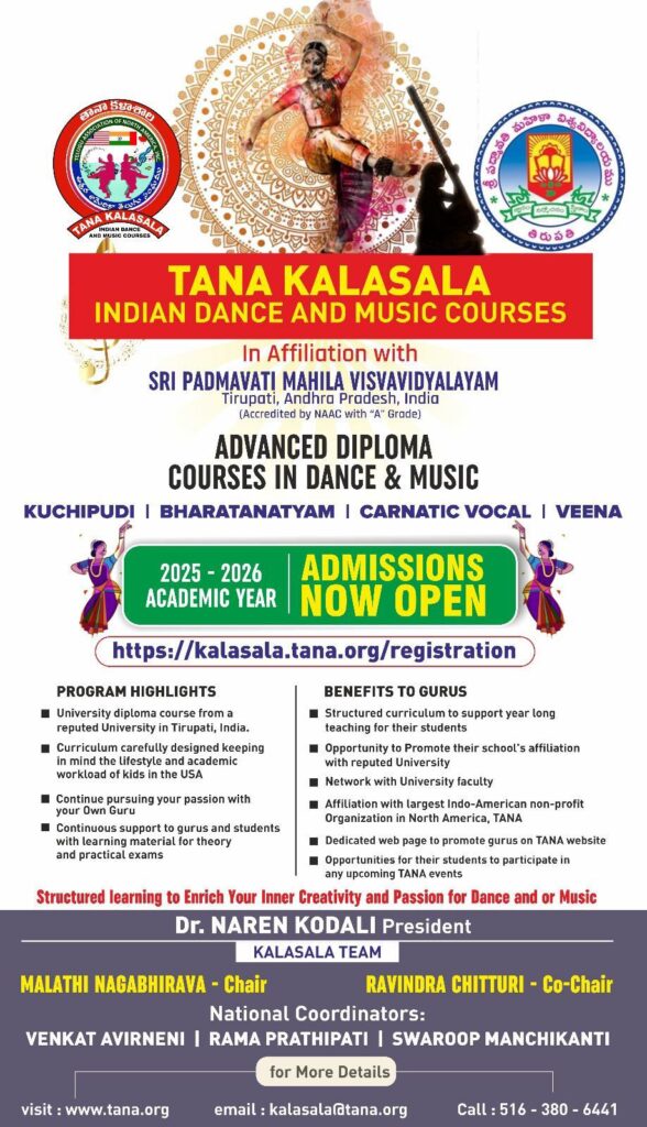 తెలుగు అసోసియేషన్ ఆఫ్ నార్త్ అమెరికా (TANA) ఆధ్వర్యంలో నిర్వహించబడుతున్న తానా కళాశాల – భారతీయ నృత్య మరియు సంగీత విద్యా కార్యక్రమానికి 2025–2026 విద్యాసంవత్సరానికి ప్రవేశాలు ప్రారంభమయ్యాయి. ఈ కార్యక్రమం తిరుపతి (Tirupati, Andhra Pradesh) లోని శ్రీ పద్మావతి మహిళా విశ్వవిద్యాలయం (NAAC “A” గ్రేడ్) తో అనుబంధంగా నిర్వహించబడుతోంది.