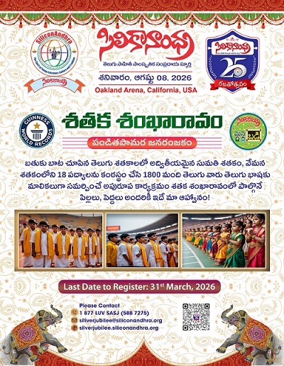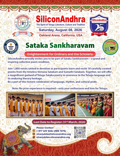 California: During this grand Silver Jubilee celebrations, SiliconAndhra is planning to pay tribute to our Telugu language with 1800 children and adults together reciting 18 poems (9 from Sumati Satakam and 9 from Vemana Satakam). Please see the highlights of the program below: