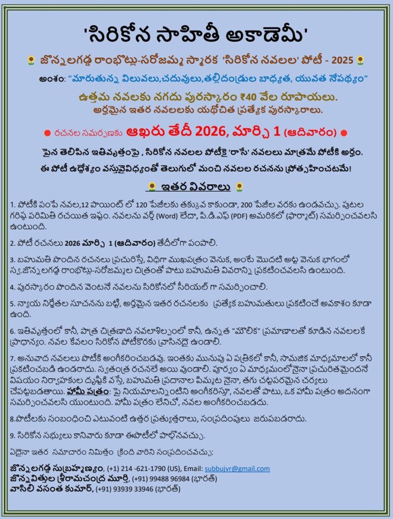 సాహితీ బంధువులందరికీ నమస్కారం. 2025 సంవత్సరానికిగాను జొన్నలగడ్డ రాంభొట్లు-సరోజమ్మ స్మారక ‘సిరికోన నవలల’ పోటీ నిర్వహిస్తున్నారు. అంశం: “మారుతున్న విలువలు, చదువులు, తల్లిదండ్రుల బాధ్యత, యువత నేపథ్యం”. ఉత్తమ నవలకు నగదు పురస్కారం ₹40 వేల రూపాయలు. అర్హమైన ఇతర నవలలకు యథోచిత ప్రత్యేక పురస్కారాలు.