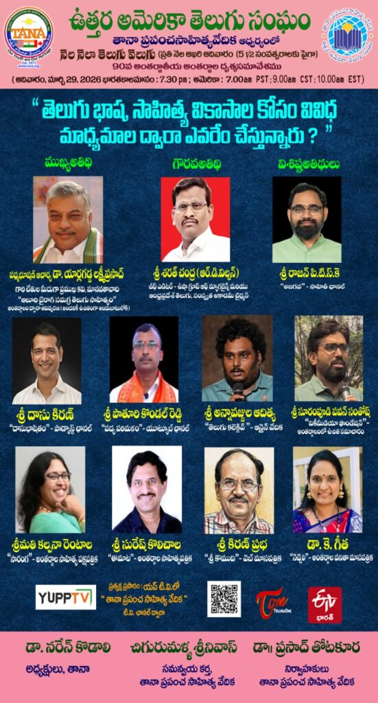 Dallas, Texas: తానా (TANA) సంస్థ సాహిత్య విభాగం ‘తానా ప్రపంచ సాహిత్య వేదిక’ ఆధ్వర్యంలో గత ఐదున్నర సంవత్సరాలకు పైగా “నెల నెలా తెలుగు వెలుగు” పేరిట ప్రతి నెలా ఆఖరి ఆదివారం అంతర్జాతీయ అంతర్జాల దృశ్యసమావేశాలు నిర్వహిస్తున్న విషయం తెలిసినదే. “తెలుగు భాష, సాహిత్య వికాసాల కోసం వివిధ ప్రసార మాధ్యమాల ద్వారా ఎవరేం చేస్తున్నారు?” అనే అంశంపై ఆదివారం జరిగిన 90 వ అంతర్జాల సమావేశం చాలా విజయవంతంగా జరిగింది.