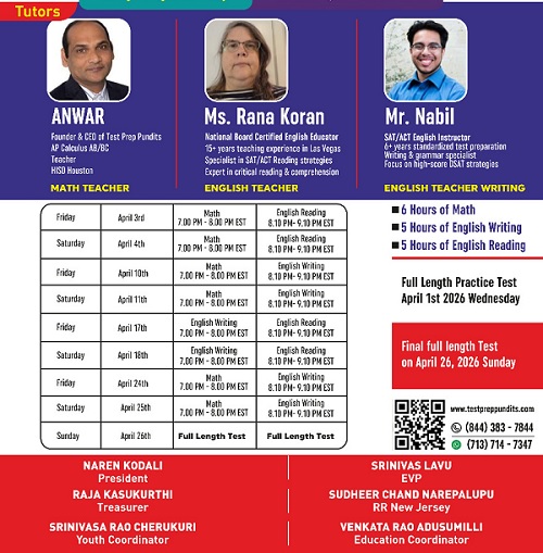 SAT పరీక్షకు సన్నద్ధమయ్యేలా హైస్కూల్ విద్యార్థులకు 4 వారాల శిక్షణ: TANA & Test Prep Pundits