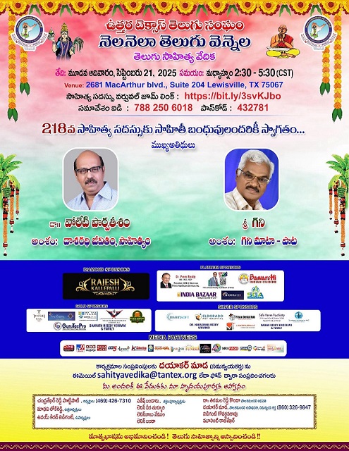 Dallas Fort Worth, Texas: డల్లాస్ ఫోర్ట్ వర్త్, ఉత్తర టెక్సాస్ తెలుగు సంఘం, టాంటెక్స్ ”నెలనెల తెలుగు వెన్నెల” , తెలుగు సాహిత్య వేదిక 218 వ సాహిత్య సదస్సు సెప్టెంబర్ 21వ తేదీ న ఆదివారం నాడు డాలస్ పురము నందు ఘనంగా నిర్వహించబడింది. తొలుత ”హిమగిరి తనయే…. ” అంటూ ప్రార్ధన గీతాన్ని చిరంజీవి సమన్విత మాడా వీనుల విందుగా ఆలపించడంతో సదస్సు ను ప్రారంభించడం జరిగింది.