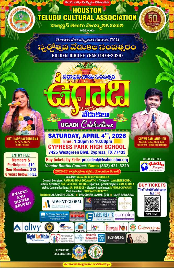 Houston, Texas: హ్యూస్టన్ తెలుగ సాంస్కృతిక సమితి (Telugu Cultural Association – TCA) స్వర్ణోత్సవ వేడుకల సంవత్సరంలో భాగంగా ‘పరాభవ’ నామ సంవత్సర ఉగాది వేడుకలను ఏప్రిల్ 4, 2026 శనివారం సైప్రస్ పార్క్ హైస్కూల్ నందు ఘనంగా నిర్వహిస్తున్నారు.