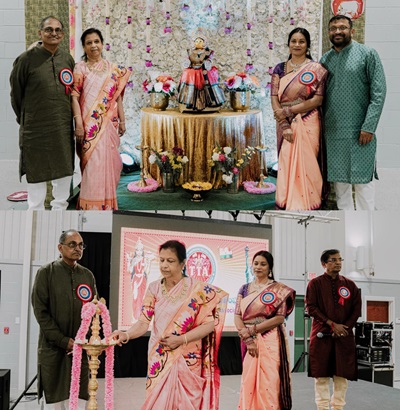 The Bathukamma celebration started at 2 PM with a traditional welcome led by the Dhol Tasha Sukumar Garugu group performing on Daff (Dappu). Guests were greeted as participants arrived elegantly dressed and presented innovative and beautifully made bathukammas, including notable examples such as Shiva Lingam Bathukamma and Amma Vaaru Bathukamma, among many other creative and traditional.